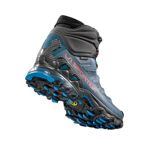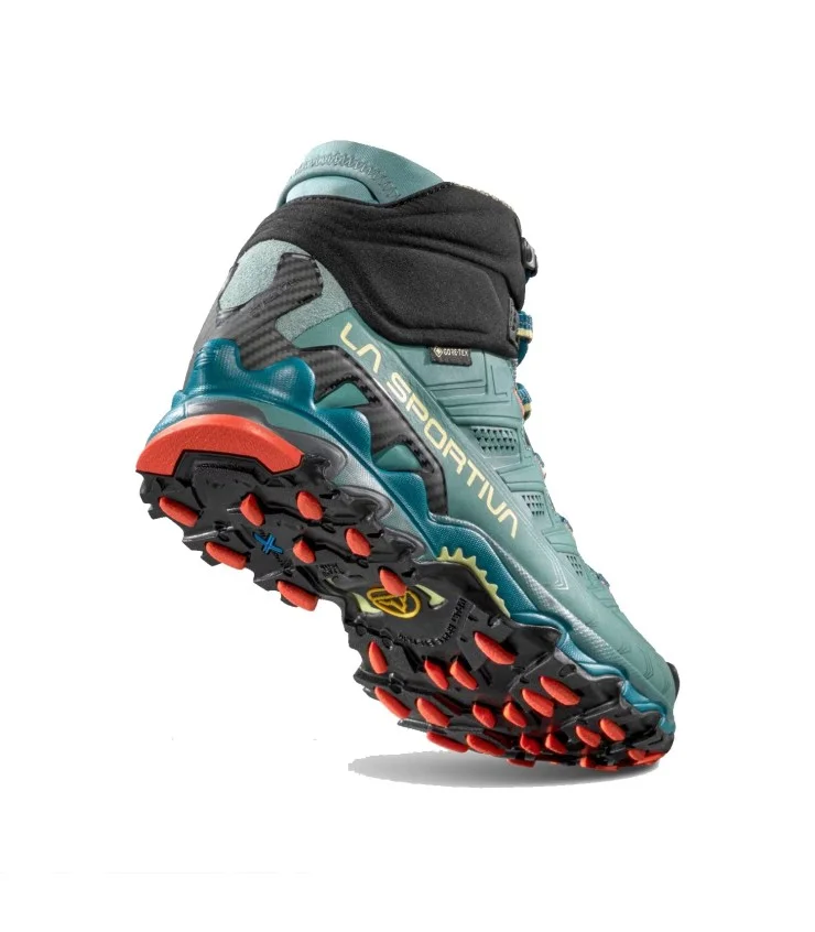 Angled rear and sole view of La Sportiva Ultra Raptor II Mid GTX women’s hiking boot showing traction lugs and Gore-Tex design